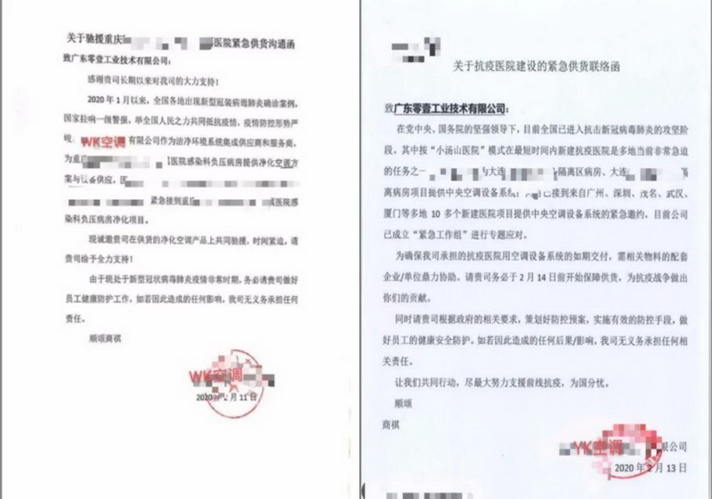 此次战”疫”,不仅仅是广州天加在行动,还有另外两家知名中央空调企业,也在为北京小汤山及各地的“小汤山”医院供应中央空调,他们是YK空调设备有限公司(以下简称“YK”)和WK空调设备有限公司(以下简称“WK”),这两家企业也是广东零壹合作多年的客户。广州天加、YK空调、WK空调作为中央空调行业排名前十的企业,肩负起了应有的责任,在这场战“疫”中,迅速响应国家的防控命令,为各地的医院改造提供中央净化空调。而广东零壹作为这三家企业的战略合作伙伴,在2月3日之后也陆续接到了YK空调和WK空调的《紧急供货沟通函》和供货请求。