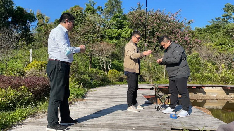 29日上午,品尝了美味的早餐后,大家有了一点宝贵的悠闲时间:有的人钓鱼、有的人游泳、有的人散步,给平时紧张的工作增加了一点美味调味剂。