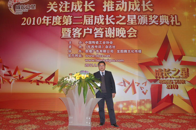 成长需要关注,关注凝聚目光;由中国陶瓷工业协会及《东西传讯》杂志社联合举办的2010年度第二届成长之星颁奖典礼于2011年1月14日晚19:00在佛山市禅城区岭南明珠体育馆西门福满楼隆重举行。佛山市正大机电配套有限公司陶瓷部马国强经理,齿轮事业部张炳湖等4人代表公司应邀参加了典礼。