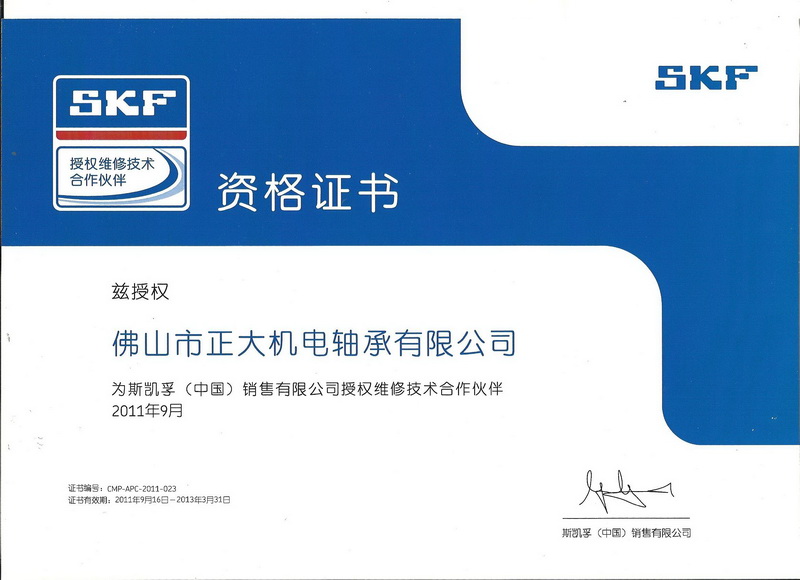 我司荣获SKF(中国)有限公司“CMP资格证书”