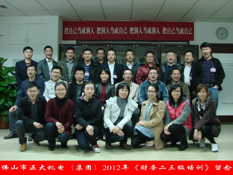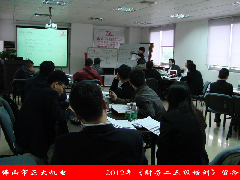 2012年2月25-26日,由正大机电公司人力资源部组织为期两天一夜的《财务二三级培训》培训班在佛山市正大机电配套有限公司三楼会议室举行;由正大机电公司下属的配套系统(含财务部人员)、自动化系统、新尚投资系统控股公司的中高层管理人员、核心业务骨干、财务部门人员共25人参加了本次培训班学习。学习由佛山市正大机电配套有限公司人力资源部经理汤运良先生主持。
