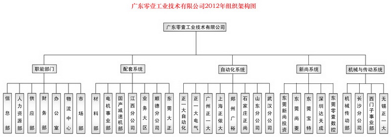 正大机电公司原用的“正大机电”系列名号在向全国发展的过程中因公司注册核名的原因导致工商注册方面产生较多阻碍,正大机电公司高层半年前就开始未雨绸缪,经过公司董事会近半年时间的酝酿,现“广东零壹工业技术有限公司”已经顺利注册成立了。今后正大机电公司对外发展的主体将由先前的“正大”系列逐步弱化并调整为“零壹工业技术”系列。广东零壹工业技术有限公司将作为正大机电公司未来的主体实现正大机电公司向全国性区域拓展的策略;现阶段的“广东零壹工业技术有限公司”包括了配套系统、自动化系统、新尚系统、机械与传动系统等四大业务模块(详见附图:广东零壹工业技术有限公司的组织架构图)。