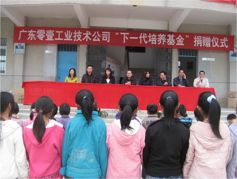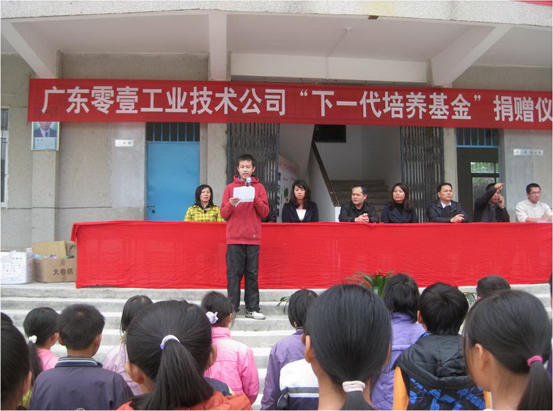新兴县教育局的领导、梧洞小学的校长为我们此行安排了一个简单而隆重的捐赠仪式。梧洞小学梁校长主持捐赠仪式,他介绍了此次活动的背景以及零壹工业的情况,接着,赵总监代表零壹工业致辞,之后,员工子女中年龄较大的练焯彬同学,代表同行的家属和员工子女发言,最后,梧洞小学梁校长和新兴县教育局崔局长,分别对此次活动致辞以及对零壹工业致谢。